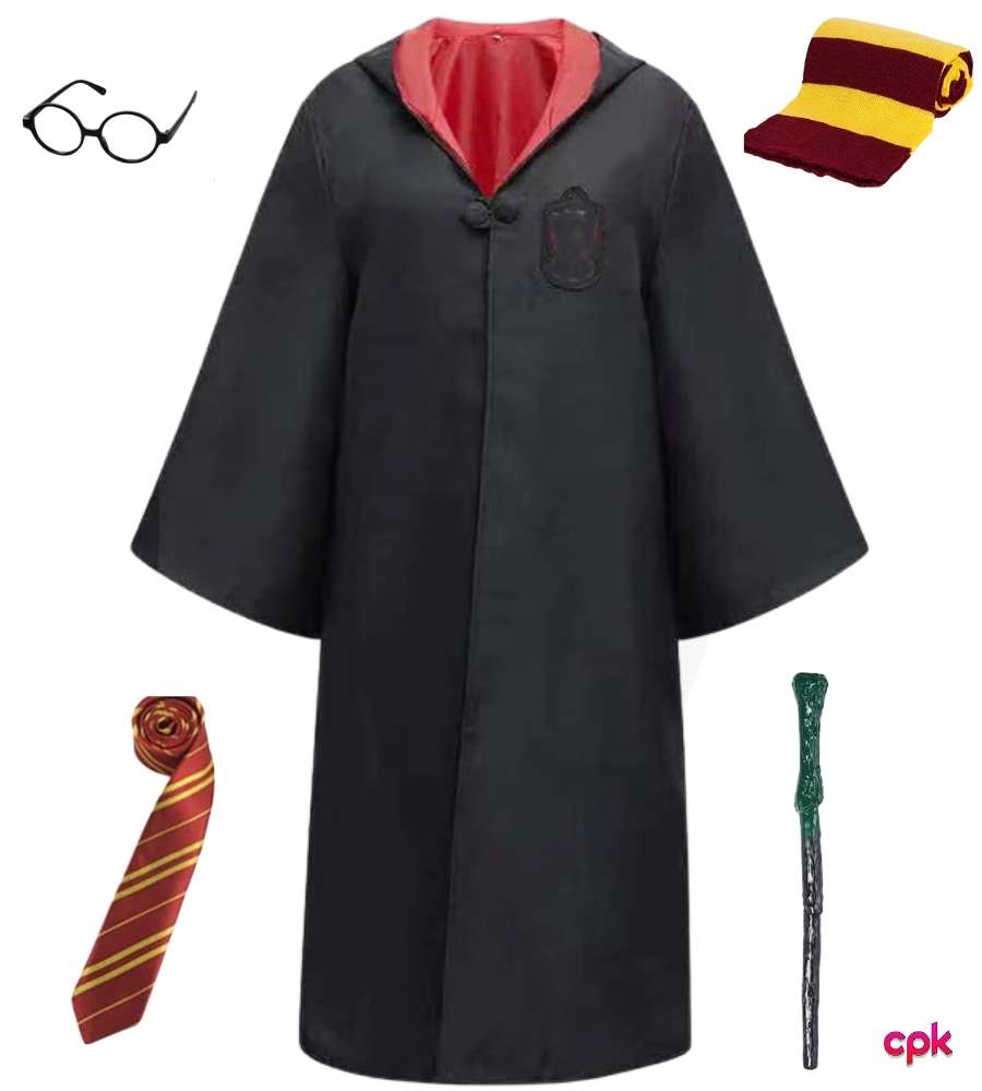 • Signature Gryffindor Robe: A high-quality black hooded cloak featuring the iconic Gryffindor House crest on the chest and a vibrant burgundy lining.
